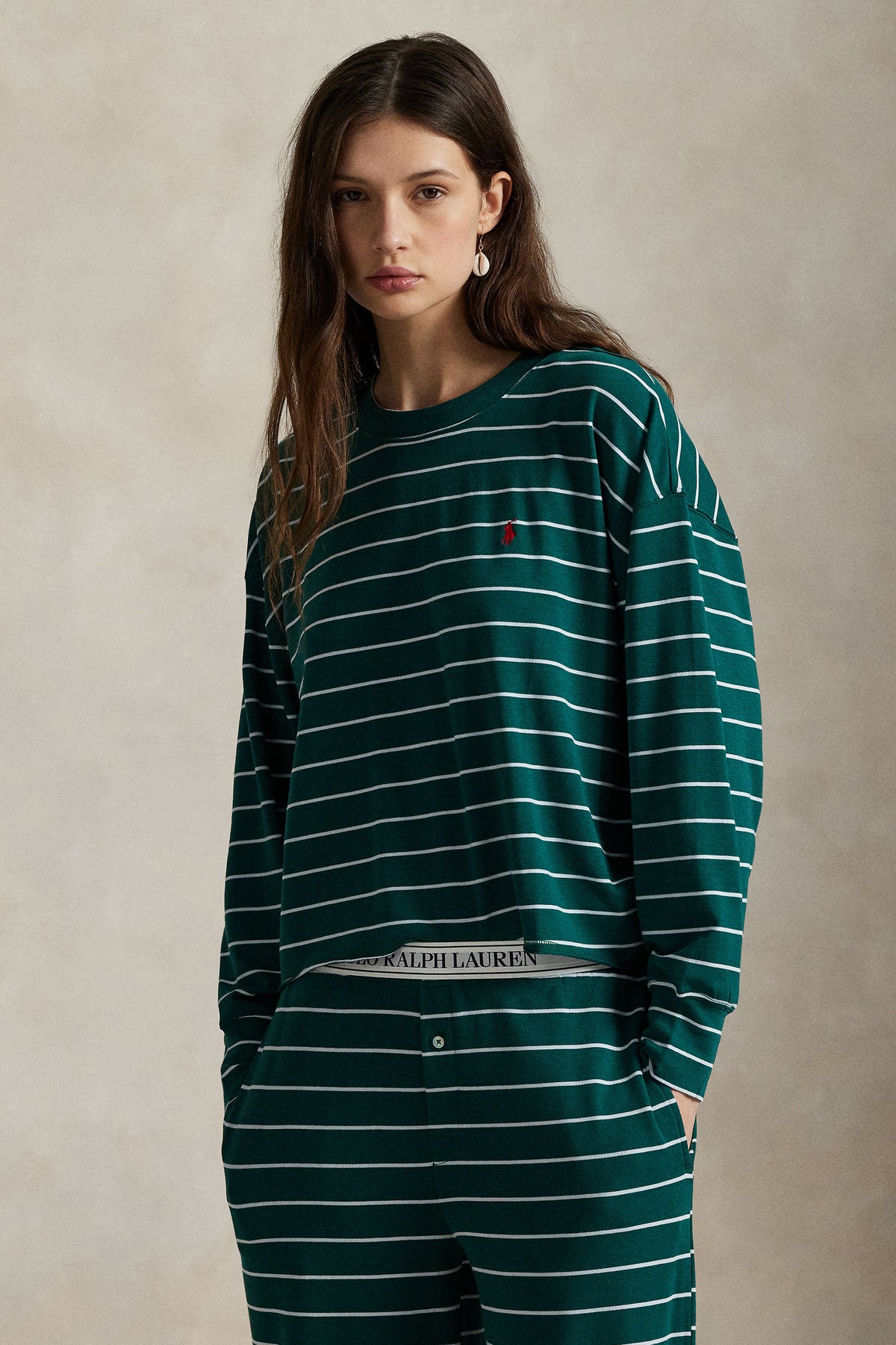 Crafted with stretch cotton-blend fabric for a soft hand and relaxed fit, this striped pajama set pairs a long-sleeve crewneck with pants featuring the signature “Polo Ralph Lauren” elastic waistband.