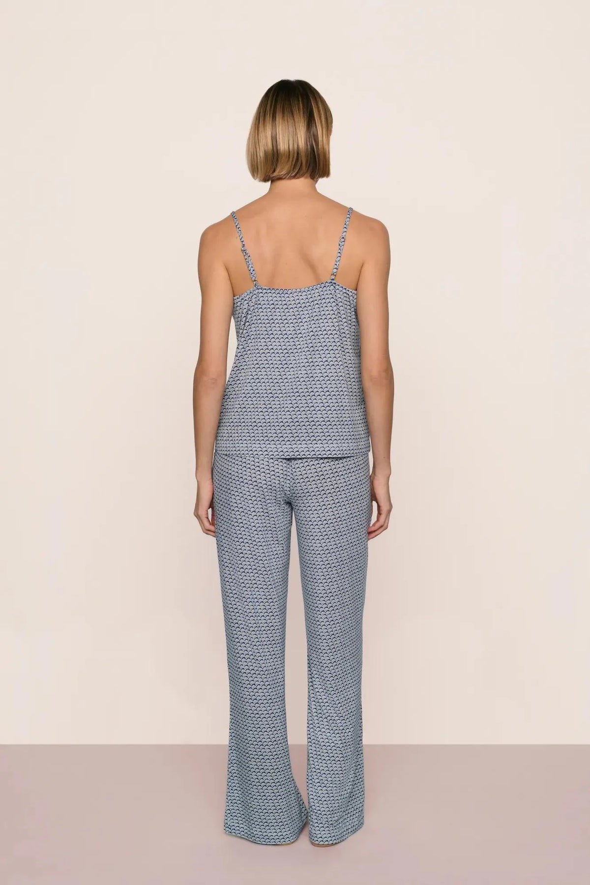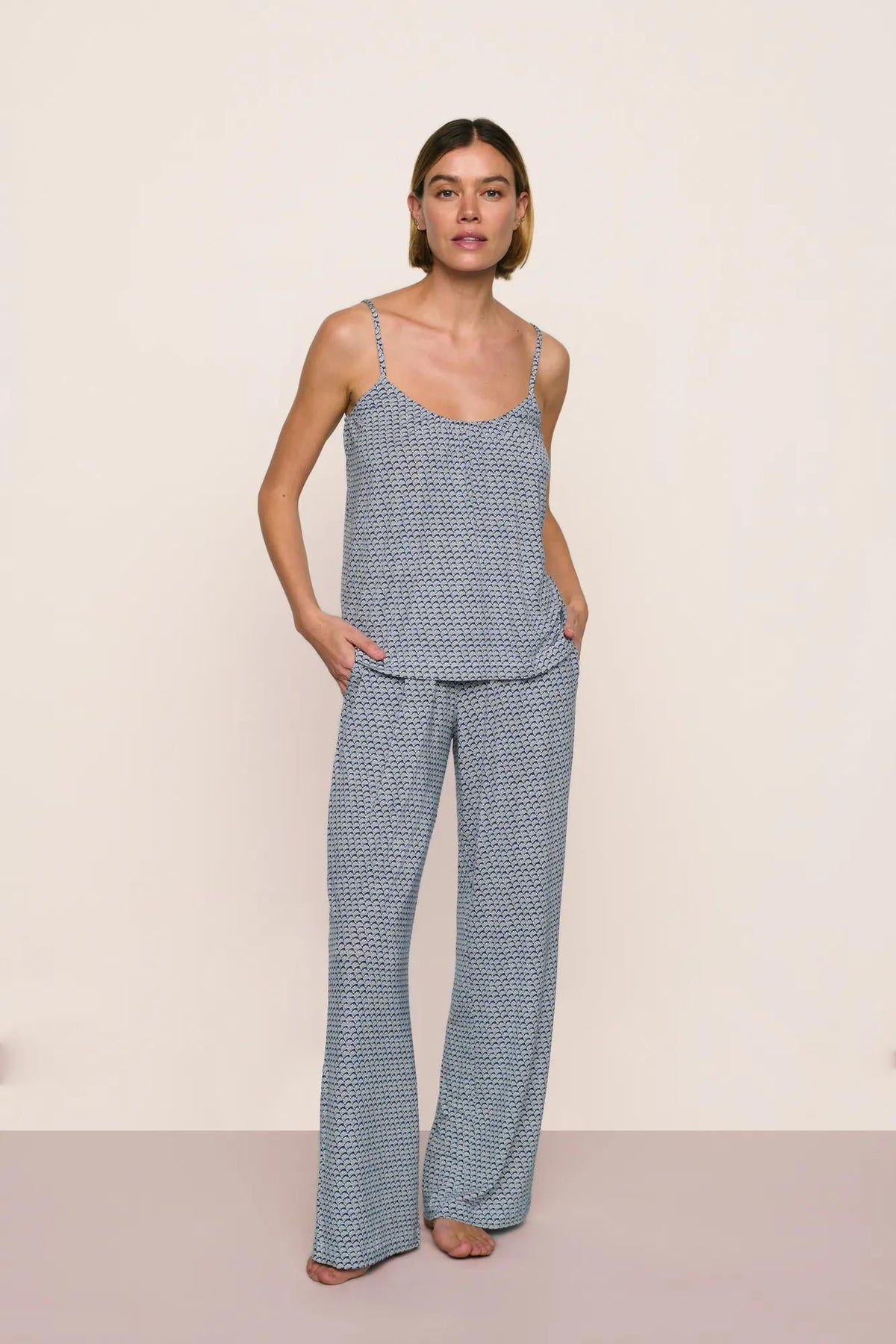 Woman wearing a blue seashell patterned camisole and pant pajama set against a beige background