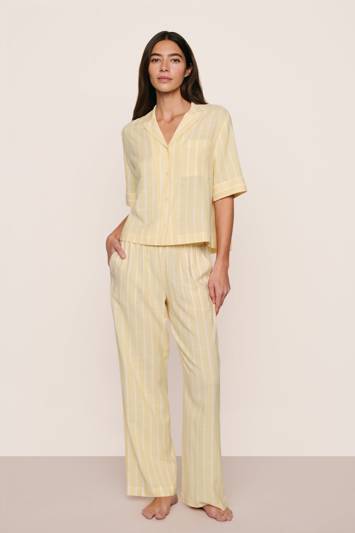 A must-have for hot sleepers and warm temps. Made from ECOVERO™ Viscose and breathable Cotton, this fabric is verified by OEKO-TEX® Standard 100, meaning it was processed without harmful chemicals. Features natural Corozo buttons, a relaxed boxy elbow-length sleeve top with a notch collar, a functional chest pocket, and a straight-leg pant with a mid-rise elastic waistband and slant pockets.