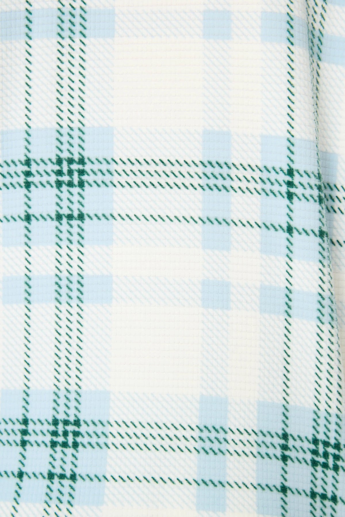 Crisp winter plaid brings a timeless touch to this thermal velour pajama set. It features a long sleeve crew top and drawstring pants, finished with a faux fly and green buttons. Cozy and classic, it’s made for holiday mornings and quiet winter nights.