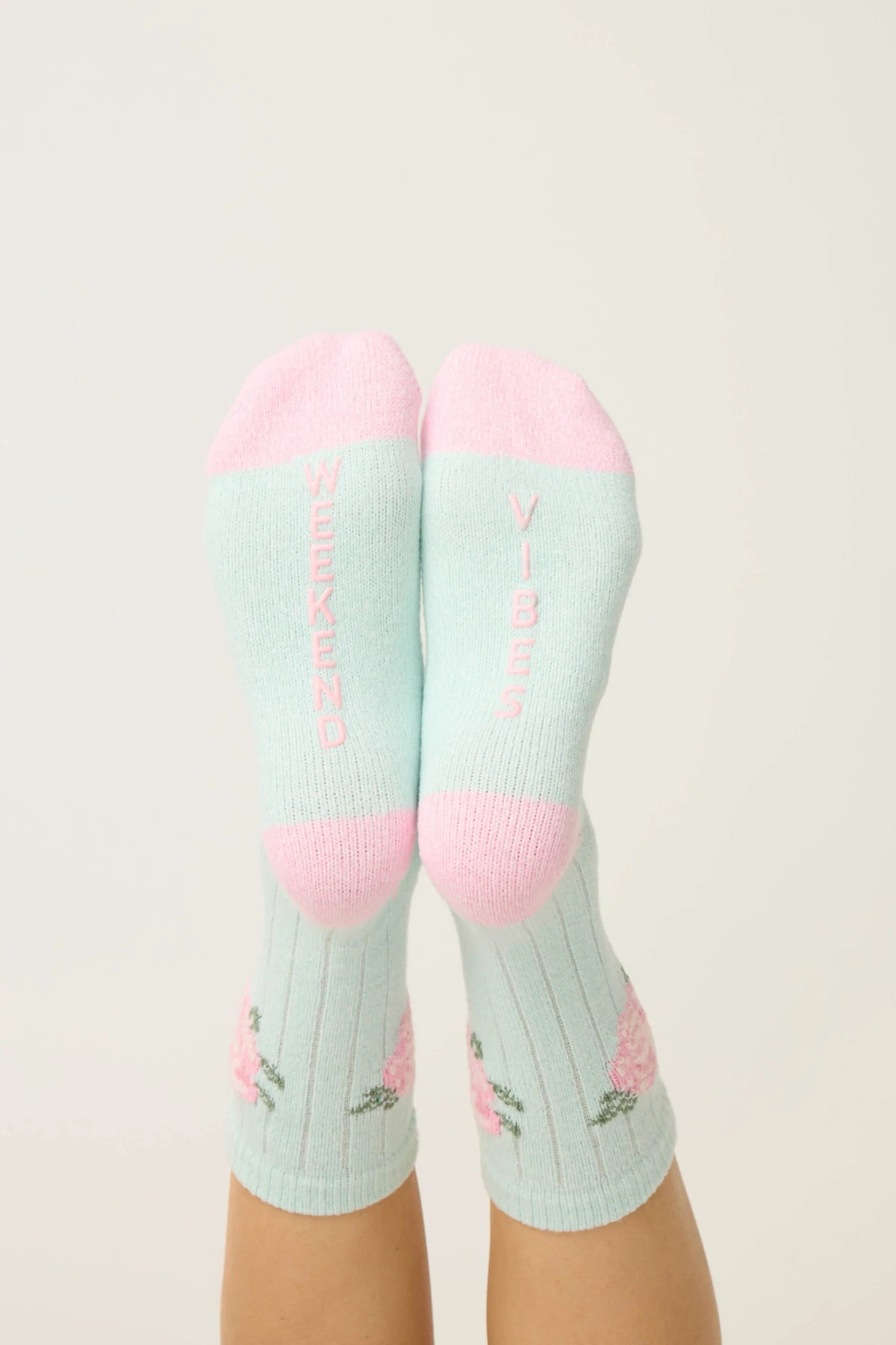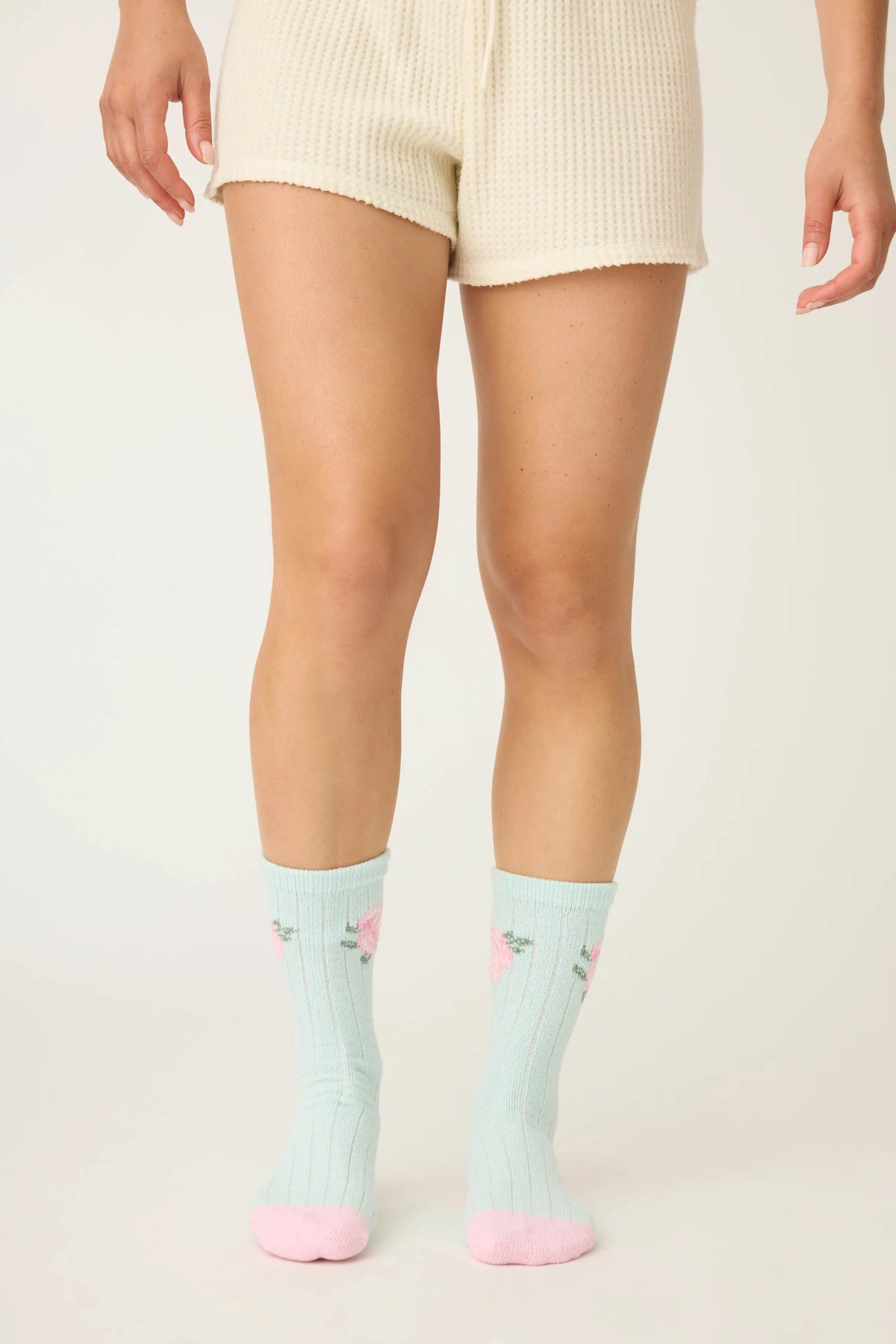 • Women’s lounge socks in mint and pink with rose graphic and pink heel and toe accents.