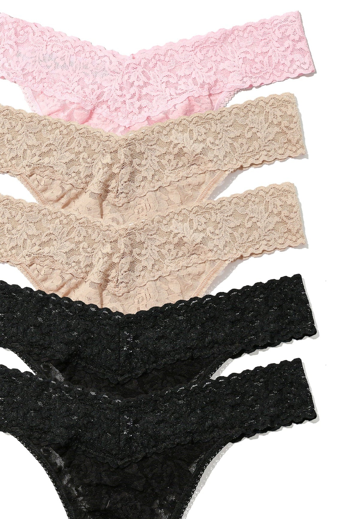 5 pack of one-size original thongs in Hanky Panky's signature stretch lace. Hanky Panky's Original Rise Thong is a must-have for every woman's lingerie drawer. Known as the world's most comfortable thong, see why this underwear has a cult following.
